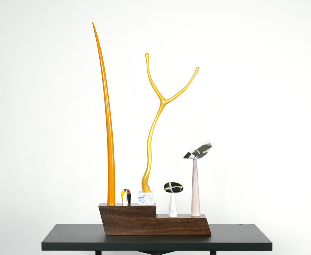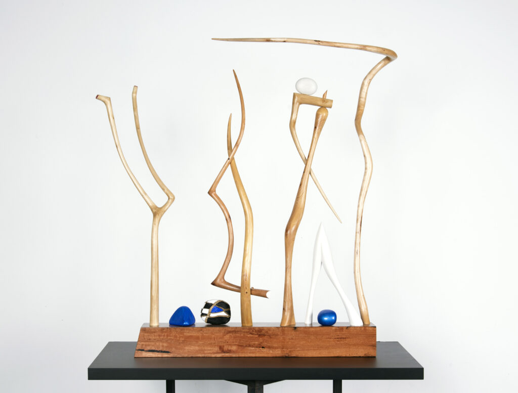 Natural and painted wood, painted Cassia Fistula seed pod, natural and painted stones, red gum